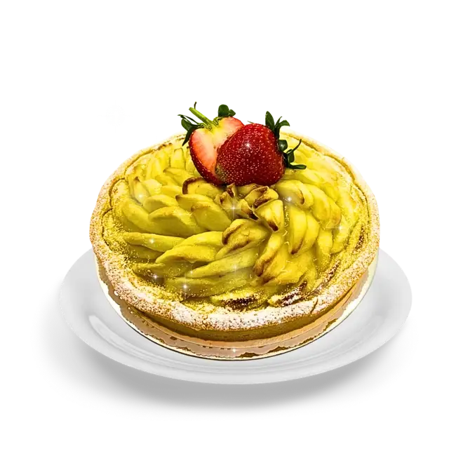 Shortbread base. Custard Filling. Topped with sliced apple.