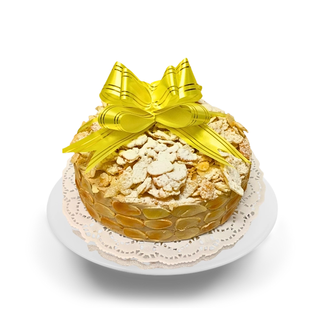 Soft almond meringue and vanilla sponge layers of hazelnut buttercream. Finished with roast sliced almond around and topped with caramelized almonds.