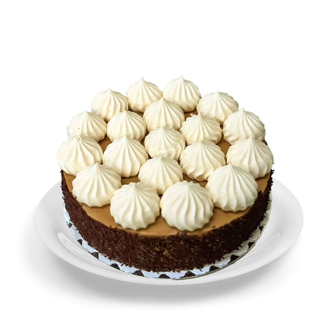 Plain meringue layers of chocolate buttercream. Finished with chocolate sprinkle and pieces of meringue on top.