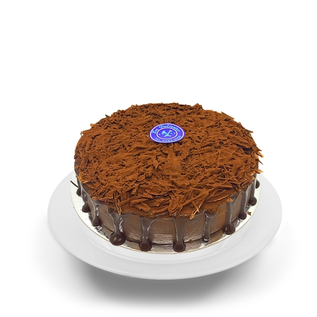 Chocolate sponge layers of dark chocolate ganache. Topped with dark chocolate glaze, dark chocolate shaving and cocoa powder