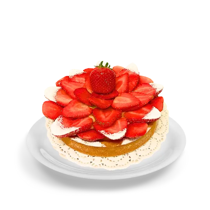 Shortbread base. Custard and cream filling. Topped with strawberry.