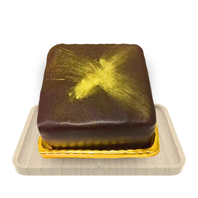 Soft almond meringue layers of dark chocolate ganache. Finished with dark chocolate glazed.