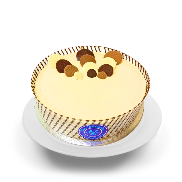 Vanilla sponge layers of vanilla buttercream. Decorated with chocolate collar sheet and spots.